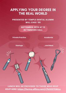 On September 29th at 12 PM in Timmons Hall, Temple Dental alumnus Will Choi (Class of 2009) presented “Applying Your Degree in the Real World.” The event explored diverse career paths available to dental graduates, including private practice, academia, startups, and more. Lunch was provided to attendees who RSVP’d.